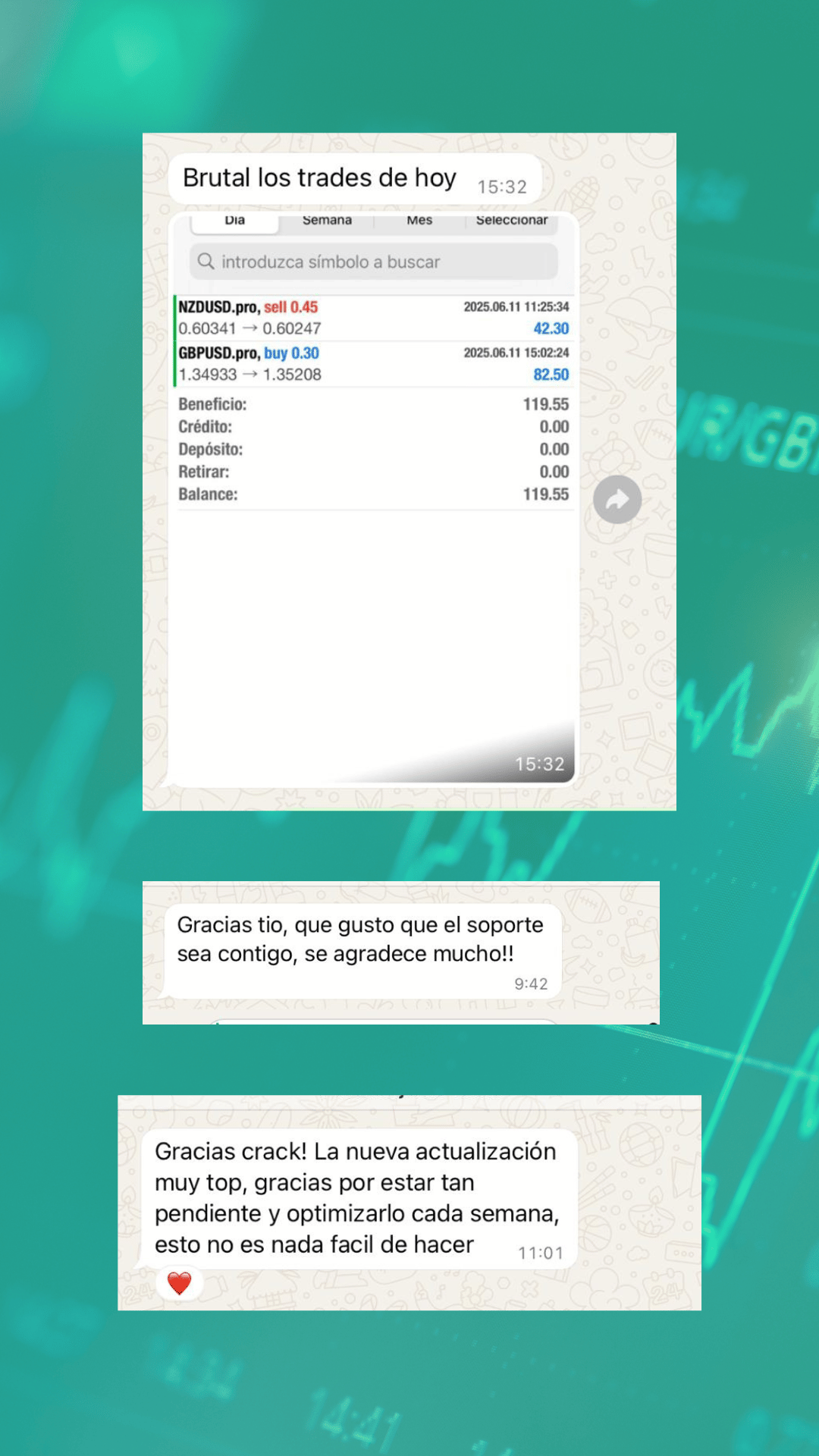 Extraídas directamente de la operativa en TradingView, con todos los datos: par, dirección, lotaje, stop y take.